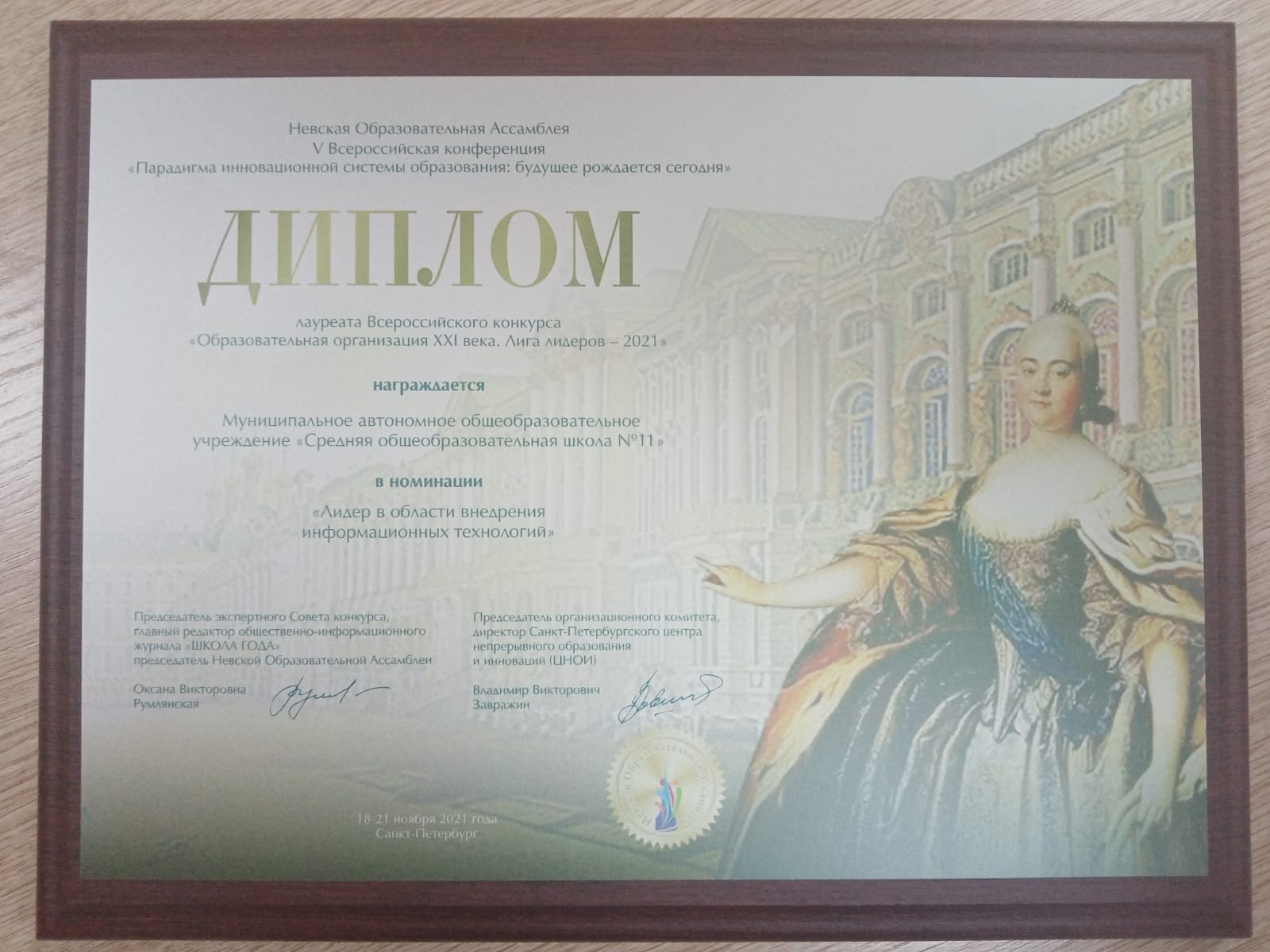 МАОУ «Средняя образовательная школа № 11» стала лауреатом всероссийского конкурса "Образовательная организация 21 века. Лига лидеров - 2021" в номинации "Лидер в области внедрения информационных технологий".