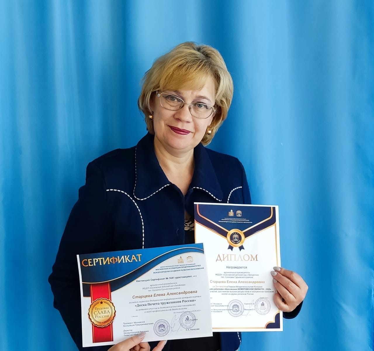 Музыкальный руководитель МБДОУ «Сосновский детский сад «Звёздочка» Елена Александровна Старцева вошла в тройку Победителей конкурса «Лучшие работники образования Кемеровской области-2022» — который проводила Международная Академия развития образования, при поддержке Московской Ассоциации предпринимателей. В конкурсе принимали участие 389 педагогов. Вместе с дипломом Победителя Елена Александровна получила Сертификат, удостоверяющий размещение педагога на «Доске Почёта тружеников России». Символично, что на «Доске Почёта тружеников России» фотографию Елены Александровны разместили в праздничный день 12 июня — День России!