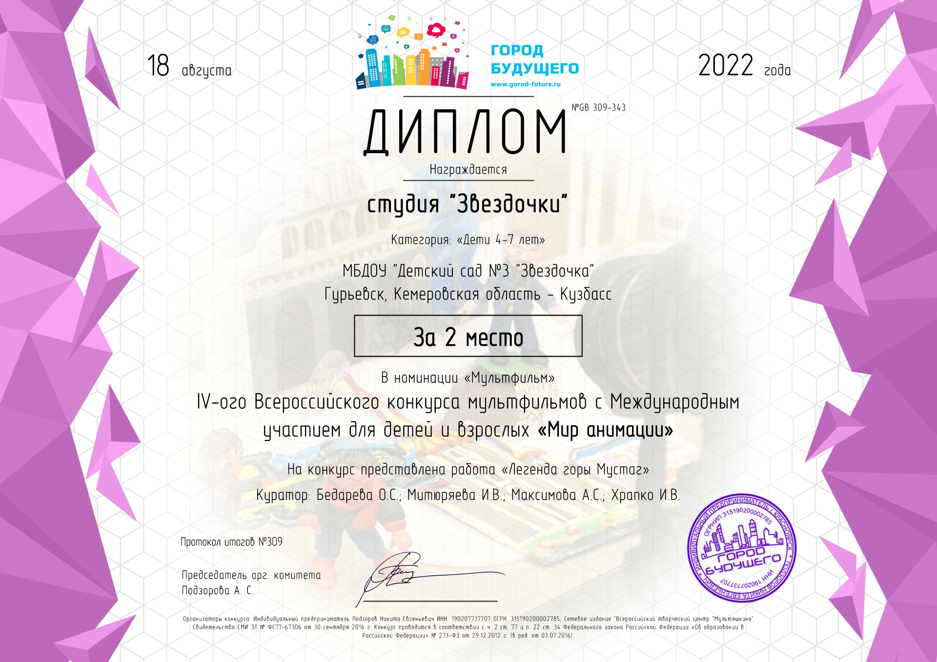 18 августа 2022года Детский сад № 3 «Звездочка» г .Гурьевска принял участие в « 4 –м Всероссийском конкурсе мультфильмов с Международным участием детей и взрослых «Мир анимации».В номинации «Мультфильм» свою работу представила студия «Звездочки» с работой «Легенда горы Мустаг» и заняли 2 призовое место!
