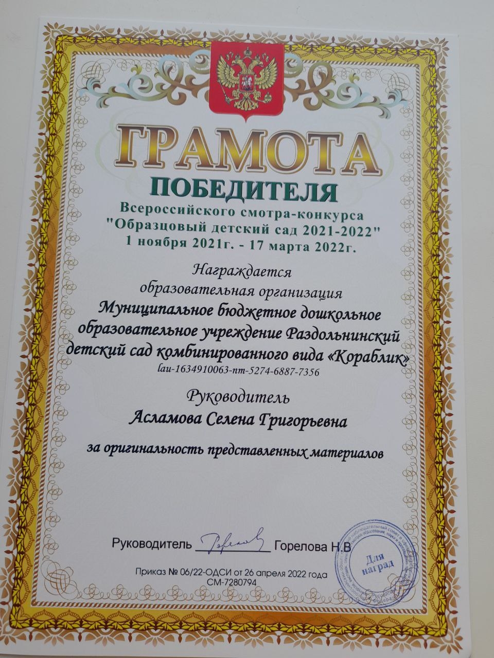 МБДОУ Раздольнинский детский сад «Кораблик» принял участие во Всероссийском смотре-конкурсе «Образцовый детский сад 2021-2022» проходившем с 1 ноября 2021г. по 17 марта 2022. Ежегодно «Всероссийский смотр-конкурс "Образцовый детский сад 2021-2022"» проводится с целью выявления 1 000 лучших организаций дошкольного образования: детских садов и других учреждений, осуществляющих уход и присмотр за детьми дошкольного возраста, обобщения и распространения опыта работы организаций дошкольного образования. Оценка деятельности МБДОУ Раздольнинский детский сад «Кораблик» осуществлялась по следующим направлениям: укрепление здоровья детей, интеллектуальное развитие детей, приобщение к общечеловеческим ценностям, развитие у детей социально-личностных качеств, познавательных и творческих способностей, художественно-эстетического восприятия, взаимодействие с семьей. Оценивалась эстетичность, красочность и оригинальность оформления электронного выставочного стенда. Педагогическим коллективом был представлен опыт работы детского сада за последние 3 года. Материалы для электронного выставочного стенда были подготовлены старшим воспитателем Малышевой И.В., воспитателями Александровой С.Л., Бобровой О.В., Журавлевой М.А., Протасевич И.В., Тархановой А.А., учителем-логопедом Матвеевой Л.Н. Окончательная подготовка и наполнение электронного стенда осуществлялась заведующим Асламовой С.Г. По итогам открытого голосования детский сад признан победителем конкурса. За оригинальность представленных материалов МБДОУ Раздольнинский детский сад «Кораблик» награжден грамотой победителя. Также детскому саду вручен подарочный сертификат на получение образовательного продукта «Образовательный процессор занятий в многомерной интерактивной среде».